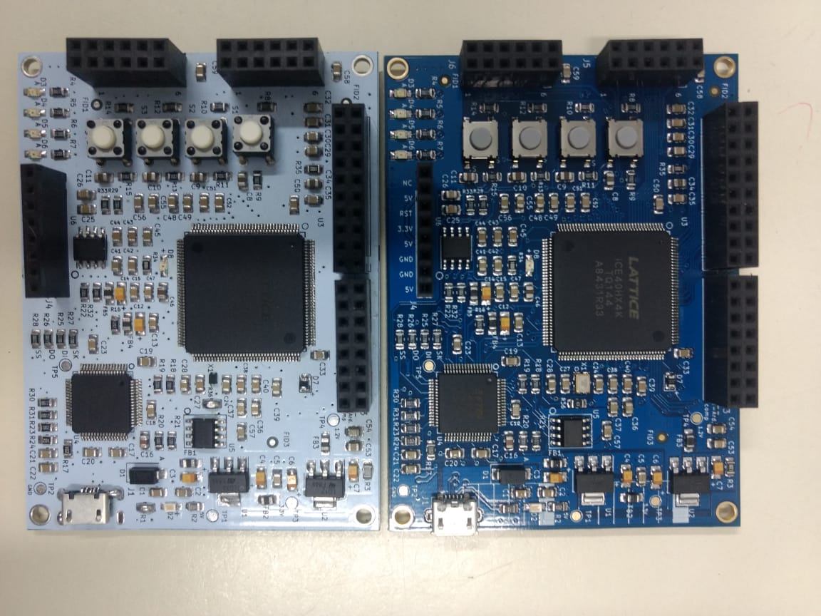 Se han diseñado y producido dos versiones de la placa, las cuales pueden verse en la siguiente imagen : la EDU-FPGA v1.0 (a la izquierda) y la EDU-FPGA v1.2 (a la derecha).